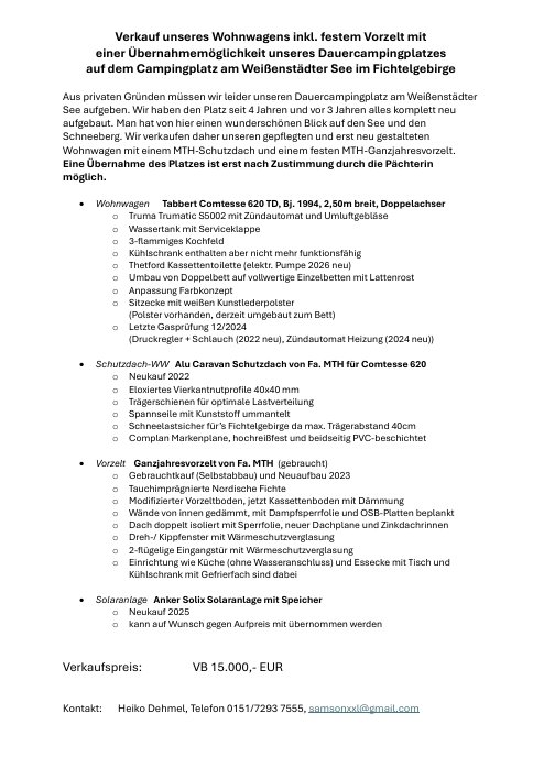 Tagespreis (Wohnmobil oder Wohnwagen) 25,00€ pro Tag & Person